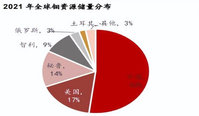 根据 USGS 数据,2021年全球钼储量1600万吨,中国储量 830 万吨,占比超过 51%,是全球钼资源最丰富的国家;美国和秘鲁分列第二、第三位, 拥有 270 万吨和 230 万吨钼储量,CR3 资源储量占全球储量的 83%。