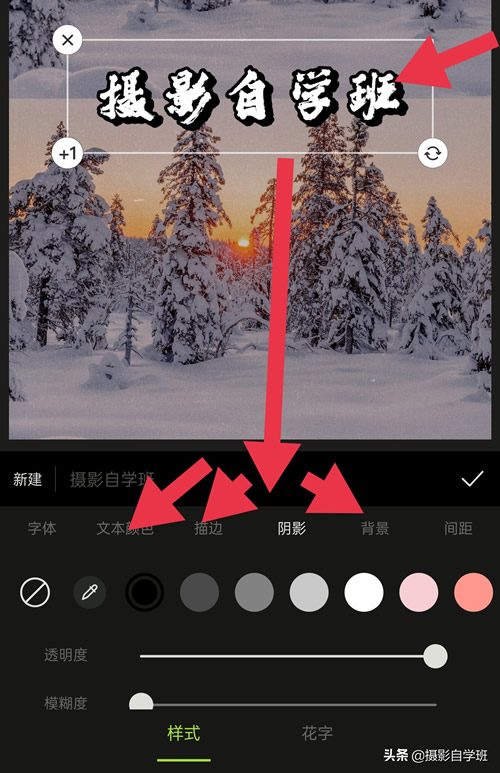 再点击下方的文字,按照之前的样式添加文字即可。还可以改变文字的字体、阴影、颜色等。