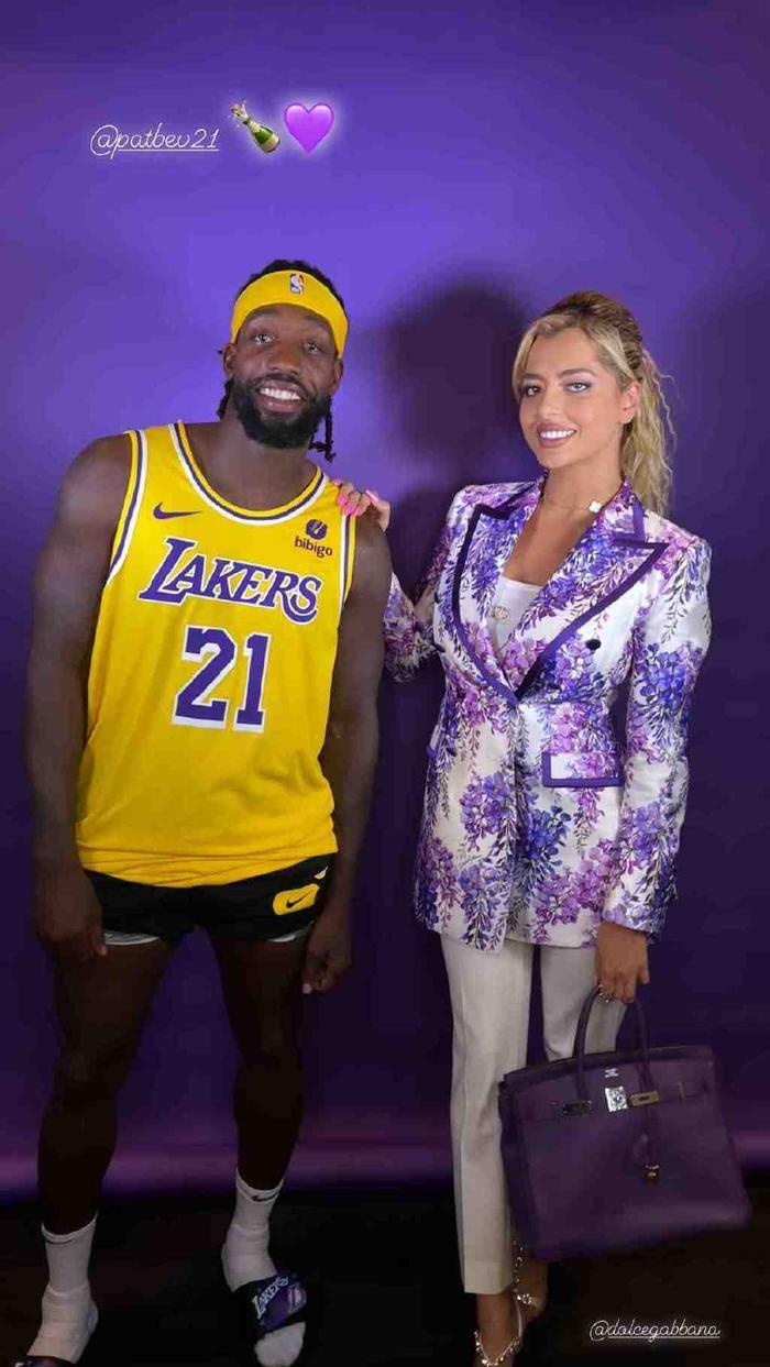 贝弗利更新社媒晒出女友Mandana盛装出席发布会的一组照片,照片是贝弗利身穿21号紫金战袍和女友甜蜜合影。