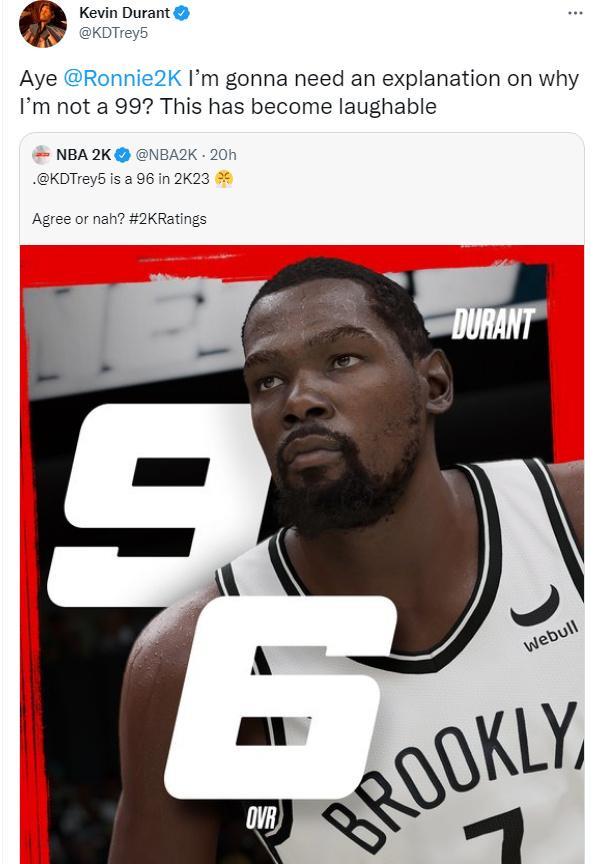 杜兰特对于自己2K能力值非常不满,他艾特了2K总裁,别写道:“我需要你给我解释一下为什么我没达到99?真的很荒唐”。2K总裁调侃杜兰特,要不要把乔丹的封面换成他的。