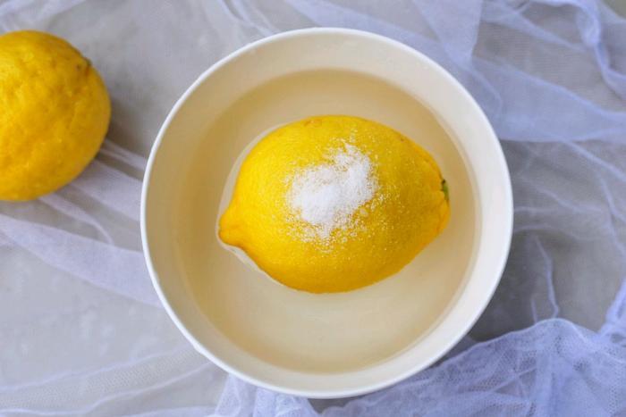 3、柠檬的表面非常难清洗,有一层蜡,大家在洗的时候先用盐搓洗,然后再放入清水中冲洗,再取出来,擦干表面的水分就可以了。