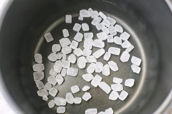 4、电饭锅刷干净保持干燥,先在内胆中放入一层冰糖。