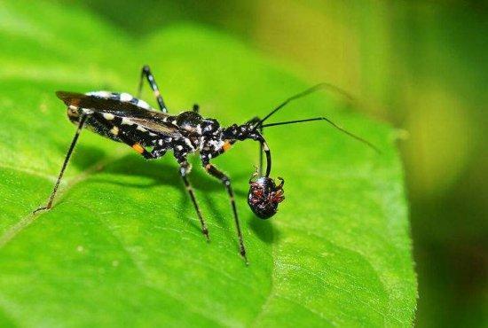 猎蝽对猎物的所作所为听起来像是科幻电影里的情节,它会使用长喙(从头部延伸的尖物)刺入猎物,然后将唾液注入猎物身上。唾液是很致命的,它会从里面消化昆虫。只有当猎物的内脏被转化为液体后,猎蝽才会把它们吸回去。