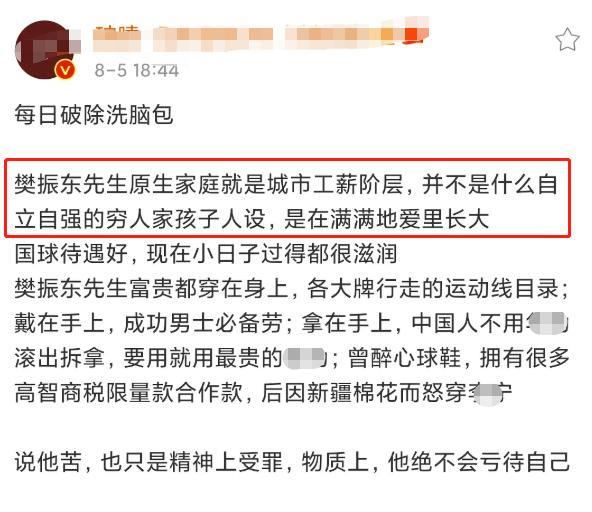 8月6日晚,有网友在论坛上发帖,称要破除“洗脑包”,让大家知道樊振东家不是贫困家庭。
