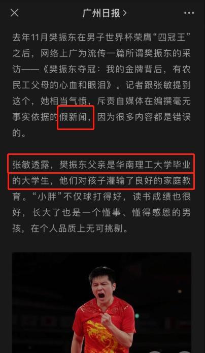 此外,樊振东在广州体校时候的恩师张敏,也发声斥责了的谣言。