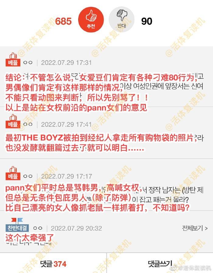 不难看到很多韩流网友甚至觉得THE BOYZ的经纪人为成员拿购物袋都属于是职场霸凌,小编都看懵了,这都是什么跟什么啊,爱豆也是人,她们不是神,要这么说那经纪人直接被辞退得了呗,这看似是在心疼经纪人,实则是在针对爱豆,这种打着正义的旗帜,去炮轰别人的人最可恨。