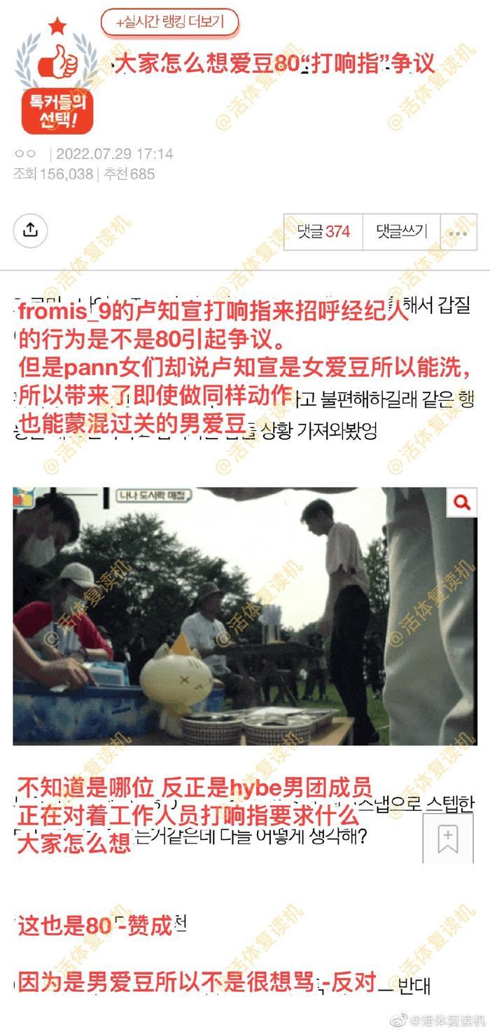 7月30日,ENHYPEN成员金善禹因为在《出差十五夜》节目中拿饭时,向工作人员打响指要饭,结果被韩流网友指责是职场霸凌,此前同样参加该节目的fromis9成员卢知宣因为打响指招呼自己经纪人的行为也被重新拿出来说事,甚至韩流网友将这两件事放在一起,说什么男爱豆比女爱豆更容易被原谅,说实话看完真的很降智。