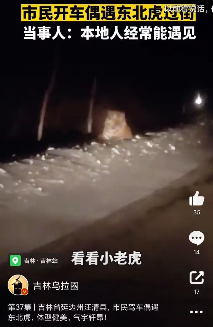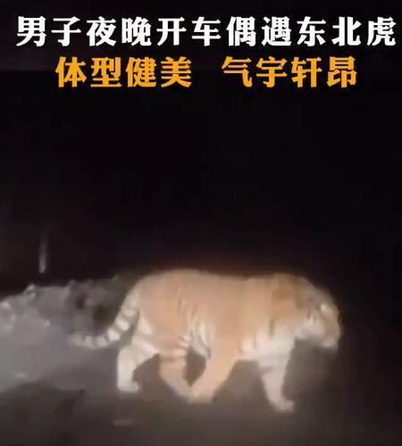 无独有偶,就在此前的12月13日,也是吉林延边,两个男子夜间开车偶遇东北虎。