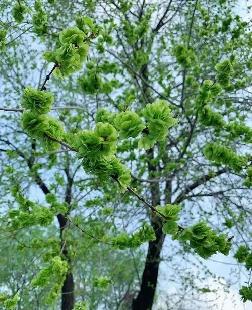 榆树钱,大家都见过,一串串、一嘟嘟的,榆树钱是榆树的果实,植物学上叫“翅果”,种子外面有一层翅膀一样的薄皮,干了之后被风吹起会发出刷啦啦的声音,会随风飞出很远,一旦遇到沟沟坎坎、缝隙就停留下来,等待来年春天生根发芽,一丛丛、一墩墩的。