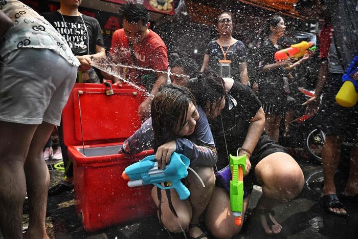 4月13日,人们在泰国曼谷街头参加泼水节庆祝活动。新华社/法新