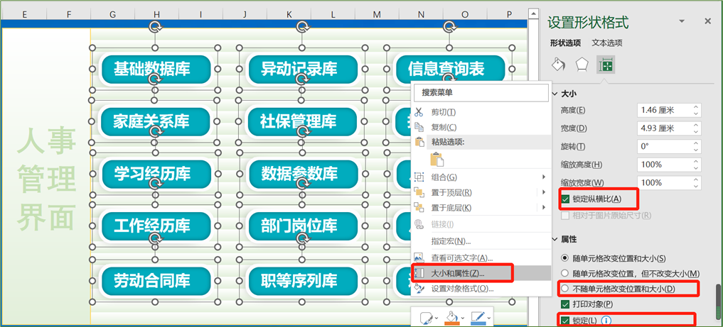 设置好链接以后,如果使用左键就会进入到链接的工作表,要想选中按钮就可以点击右键,然后CTRL+A选中所有图标,点击右键,在命令卡中选择“大小和属性”。分别把“锁定纵横比”、“不随单元格改变位置和大小”、“锁定”前面的勾打上;如果打印工作表进需要打印图标,可勾选,否则空。 “审阅”选项卡,“保护工作表”,将导航页锁定,这样图标就不会被随意拖动,链接功能不会受到影响。