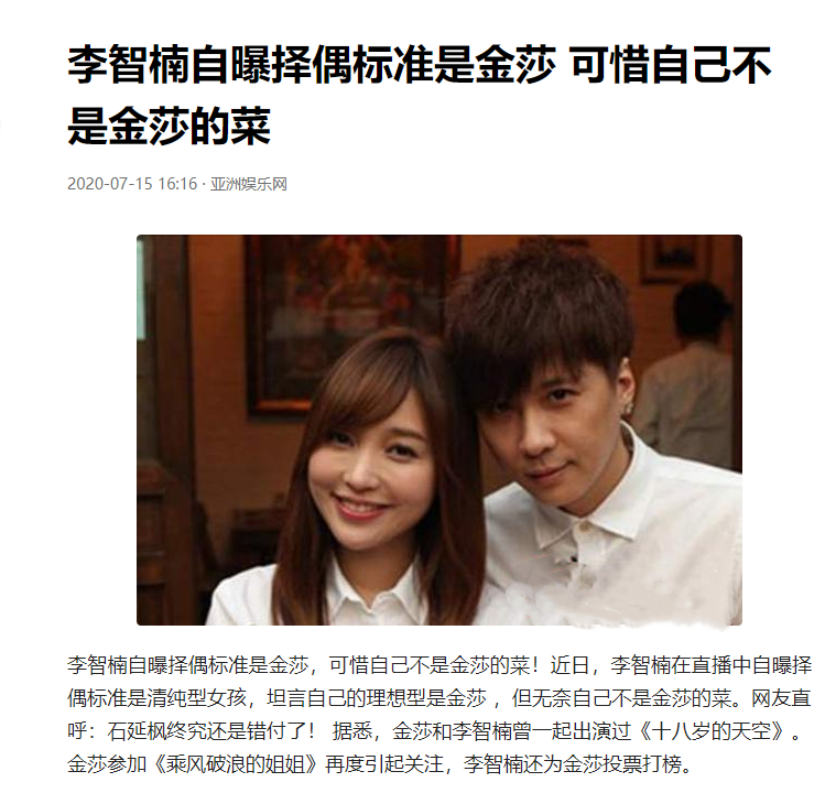 李智楠很喜欢金莎,他的择偶标准就是金莎。