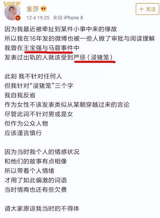 因为浸猪笼一词有所不当,金莎在2018年12月向马蓉道歉。