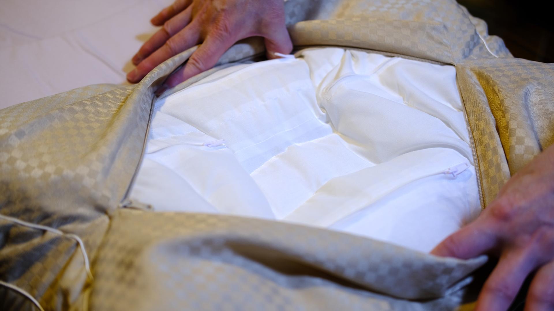 我们将两个枕头拆开看看。