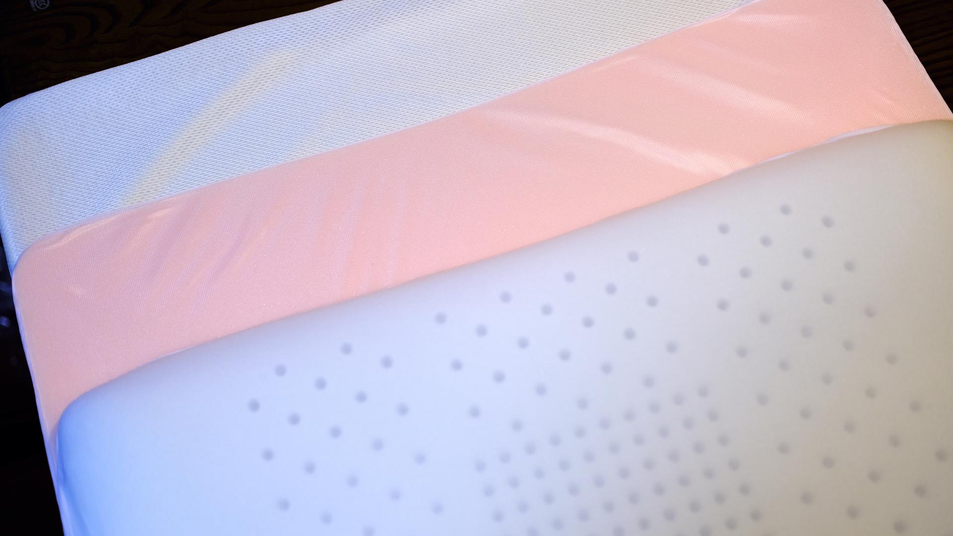 上层是完整的一块记忆慢回弹绵,接着下面是一块高度调节垫子,如果你觉得枕头高,可以将这块垫子去掉。接着就是整个网格的整套了。