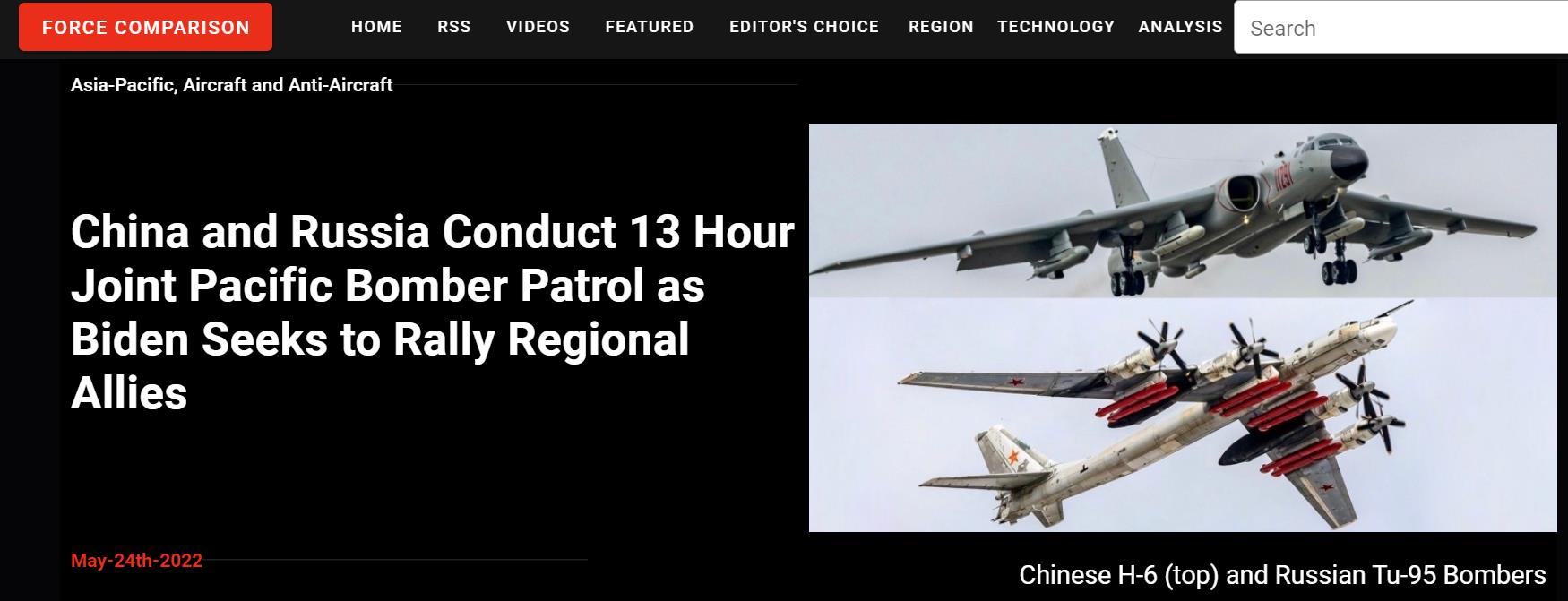 5月24日,中俄两国空军进行了第四次空中战略巡航,两架图-95MS战略轰炸机与四架轰-6K远程轰炸机完成了在日本海、东海以及西太平洋上空的战略巡航,将中俄两国的军事合作提升到了一个新的高度,展示了中俄空军强大的战略打击能力。由于中俄轰炸机此次联合战略巡航正直拜登访问日本之际,这个事件自然也就成为了西方媒体的热点话题。