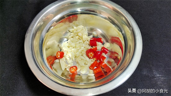 第三步:料头也很简单,3瓣大蒜剁成蒜末,两个小米椒切圈,不喜欢辣的可以去掉小米椒。