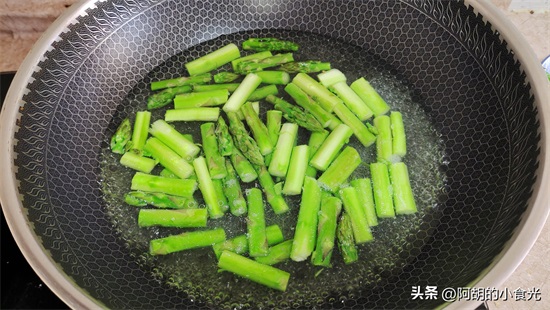 第六步:倒入焯水后的芦笋段,淋入两汤匙的生抽和一汤匙的蚝油,适量的食盐,保持大火翻炒均匀,而后准备少许水淀粉淋入锅内翻炒均匀,使汤汁能够薄薄地挂在食材上即可,切莫加的太多。关火后撒入黑胡椒适量拌匀就出锅。