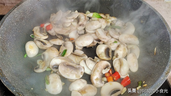 第五步:另起锅烧油,先把蒜末和小米椒圈下锅炒出香味,再下入口蘑片翻炒,此时保持中大火将口蘑煸炒至微微发软的程度即可进行下一步。