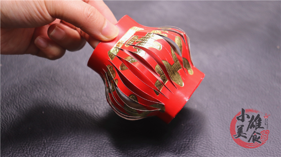 8、准备好灯笼的底部,接着我们还要准备一条,刚刚剪出来的废边缘,将它折在一起以后,再粘到红灯笼的顶部,一个完整的红灯笼,就算完成了。