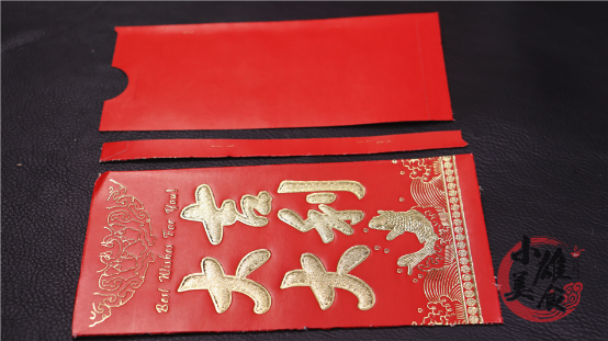 2、一个完整的红包,我们可以把它分割成两片,接着我们要取红包的背面,然后用剪刀把它的边剪掉一部分,大概是一厘米左右的宽度。