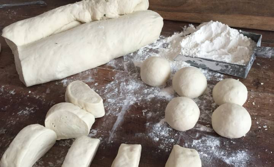 发酵好以后的老酵面,我们需要将其取出,然后对其进行揉搓,将老酵面中的气泡揉搓掉。等到老酵面被揉至表面光滑时,就可以将其搓成长条,并用菜刀切成馒头胚备用。