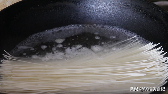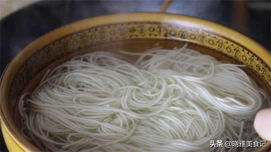 4、接下来这一步,我们就要开始煮面了。在锅中烧开水,把买来的面条放进去煮熟。这里注意,我们在煮面条的时候在水开前加入适量的凉水,这样可以让面条受热均匀,面条的口感更加劲道。