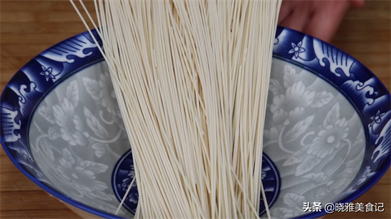 5、在我们把面条煮熟后,将面条都捞出来,过一遍凉水,可以让面条冷却,也能防止面条坨在一起,让面条的口感变得更加劲道。