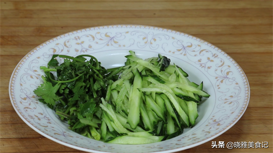 3、在加入调料之余,我们还要准备一些配菜,既可以点缀凉拌面的成色,补足拌面的营养。准备一根黄瓜,清洗干净后,将黄瓜切成细丝,装盘备用,然后取适量的香菜切成小段,装盘备用。