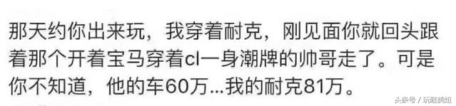 刚见面你就回头跟着那个开着宝马穿着cl一身潮牌的帅哥走了。可是你不知道,他的车60万我的耐克81万。