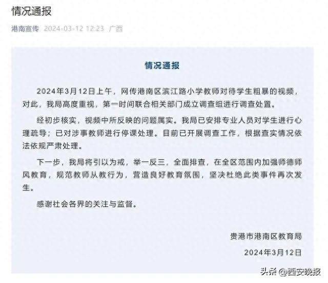 3月12日,广西贵港市港南区教育局就“一小学教师扇打拖拽学生”发布情况通报称,经初步核实,视频中所反映的问题属实。已安排专业人员对学生进行心理疏导;已对涉事教师进行停课处理。