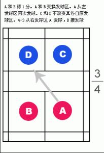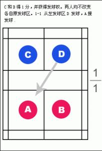 A和B对C和D的双打比赛。A和B赢了挑边并选择了发球。A发球C接发球。A为首先发球员,而C则为首先接发球员。