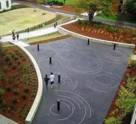 在设计中,经常采用直线形的线条铺装引导游人前进;在需要游人驻足停留的场所,则采用无方向性或稳定性的铺装;当需要游人关注某一重要的景点之时,则采用聚向景点方向的走向的铺装。另外,通过铺装线条的变化,可以强化空间感,比如用平行于视平线的线条强调铺装面的深度,用垂直于视平线的铺装线条强调宽度,合理利用这一功能可以在视觉上调整空间大小,起到使小空间变大,窄路变宽等效果。