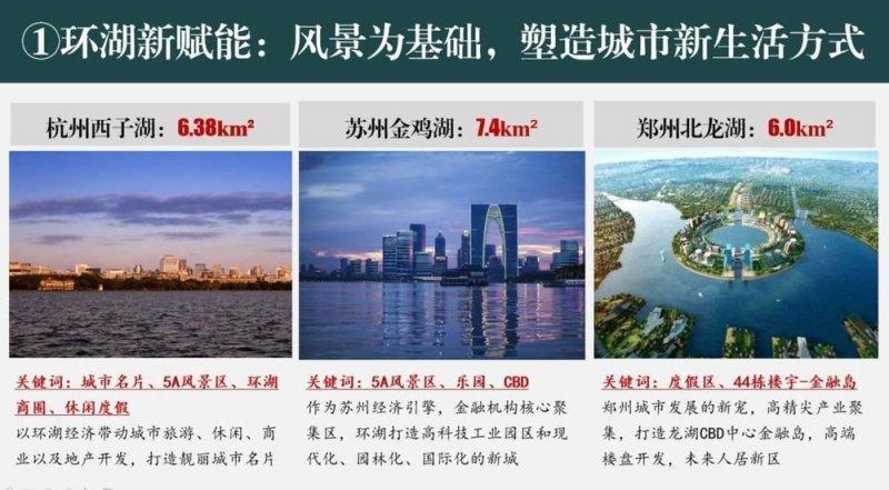 杭州西子湖6.38km2,全球旅游名片,构筑文商旅消费圈;苏州金鸡湖7.4km2,5A级风景区,城市文旅地标,工业核心区;郑州北龙湖6.0km2,郑州新兴度假区,打造龙湖CBD中心金融岛(44栋楼宇),以及高端楼盘开发。