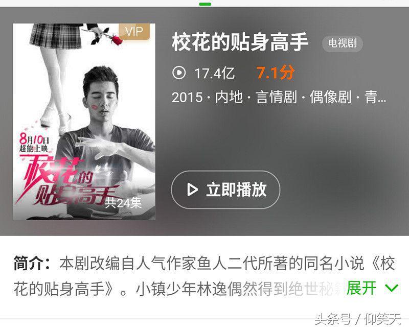 由小说改编成电视剧的不在少数,但《校花的贴身高手》这本小说改编的网剧也相当成功,到现在播放量高达17。4亿,而第二季的网剧播放量也接近5亿,同时还出了页游和手游版的《校花的贴身高手》,而小说作者鱼人二代也凭借这一部小说上了网络作者富豪榜,可以说鱼人二代现在也身价不菲了,人是出名了,但小说却是越写越水了。