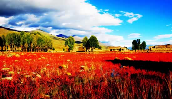 ·红草地是一个足球场大小的湿地,季节性很强,而且时间很短,只有十几天时间可以看到。 ·每年的9月底10月初,一团团一簇簇水草象被点燃了一样,红得像火,吸引川藏线上无数的行人驻足。 ·拍摄红草滩最好是有阳光的时候,色泽会更艳丽而且比较有层次感;雨后天晴的时候,效果最佳。