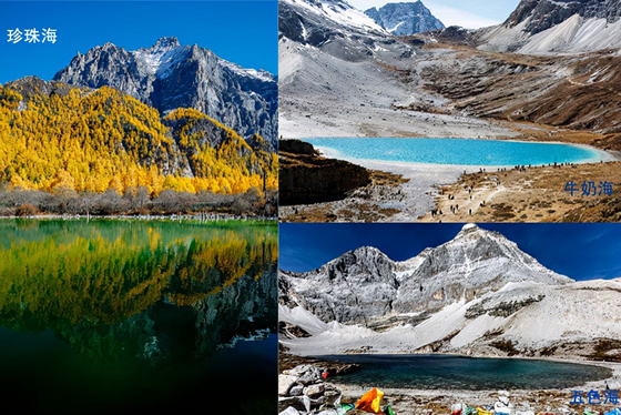 三海子指的是牛奶海、珍珠海和五色海。三个海子藏在雪山中,坐落在高原上,清澈无比,美轮美奂。牛奶海湛蓝清澈,周边有一圈乳白色,很是奇妙。珍珠海是观赏仙乃日的极佳地点,可以看到神山倒映在水面上的景观。五色海有着奇妙的传说,在阳光下会折射出五种颜色。