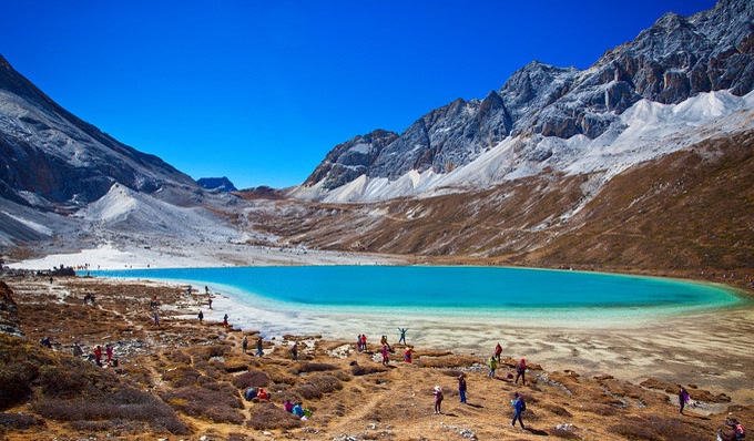 ·牛奶海位于央迈勇神山脚下的山坳里,是一个面积不大状如水滴的古冰川湖。 ·这里四周雪山环绕,湖水清莹碧蓝,湖畔则是一圈乳白色环绕,故称牛奶海。 ·湖水深浅不一,近岸由于湖底远久植物的沉淀而略显黑色,越到深处越蓝得透亮。 ·站在这里回望神山,近在咫尺,山上云雾升腾,寸草不生的碎石遍布、十分荒凉。