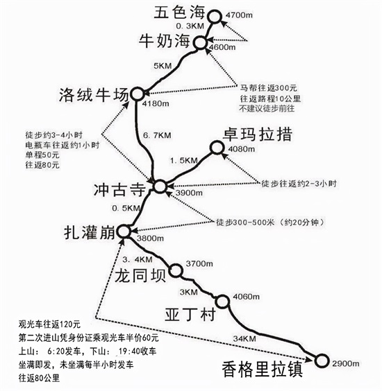 稻城亚丁景区游览路线推荐稻城亚丁景区有二条游览线路第一条游览路线:从景区门口乘坐景区观光车到扎灌崩,步行0.5km至冲古寺,可选择乘坐电瓶车到诺绒牛场。从诺绒牛场到牛奶海还有5KM,其中3KM为土路比较好走,2KM为上坡路,坡度很大,应穿舒适鞋子。从牛奶海到五色海还有1KM,海拔较高。这条线路比较长,请量力而行。第二条游览路线参考:从景区门口乘坐景区观光车到扎灌崩,步行0.5km至冲古寺,后步行1.5km到珍珠海(海拔3950米)、仙乃日神山。这条线路全是金属栅格栈道,很好走,慢走2小时以内上去完全没有问题。Tips:1. 冲古寺到络绒牛场电瓶车往返80元,单程50元,也可选择徒步,徒步2小时左右。但是若决定要徒步上牛奶海最好选择乘坐电瓶车,因徒步牛奶海需要更多的体力。2. 络绒牛场到五色海、牛奶海骑马往返为500元/匹/人,价格为景区统一执行价,骑马往返时间约4小时。马匹只能到达牛奶海,上五色海需要继续步行1KM。(旺季可能出现马匹不足的情况)