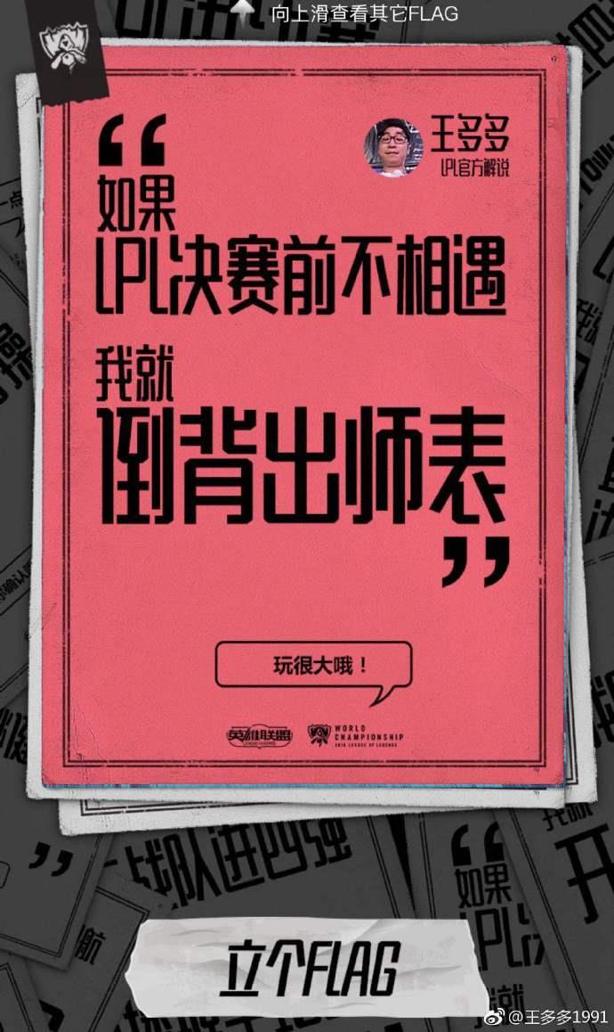在初次登场LPL解说的时候,其酷爱用押韵的诗句来解说比赛成为了赛场上的一个亮点,估计官方也是为了能够让解说们能够百花齐放,而且在LOL界这种解说其实也是史无前例的行为,官方也说不好观众会不会喜欢。所以我们来看看王多多的经典句子有哪些: