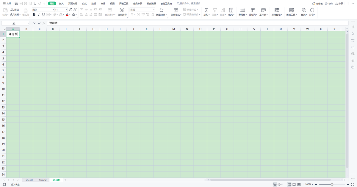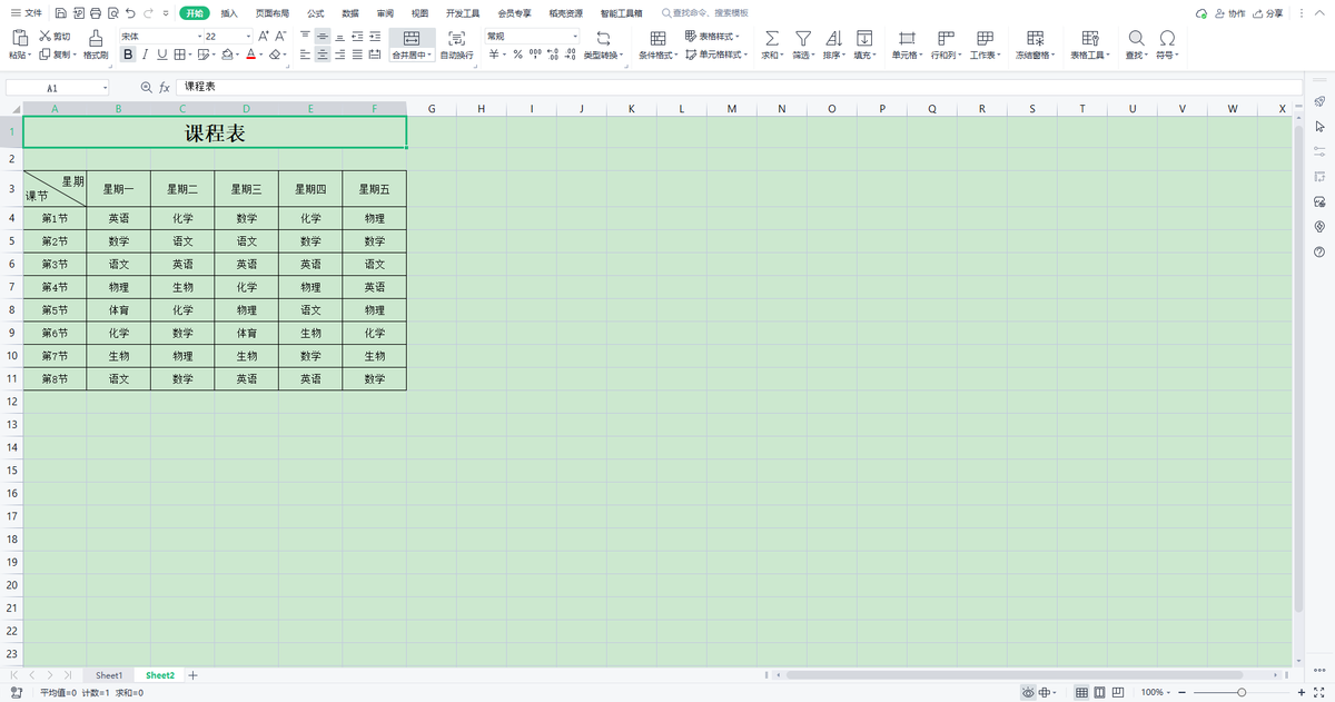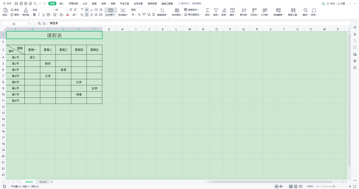 17、最后,我们再选择A1单元格,按住鼠标向右拖动到与课程表一样的宽度,点击开始菜单栏中的“合并居中”,再将标题设置成合适大小就可以了;