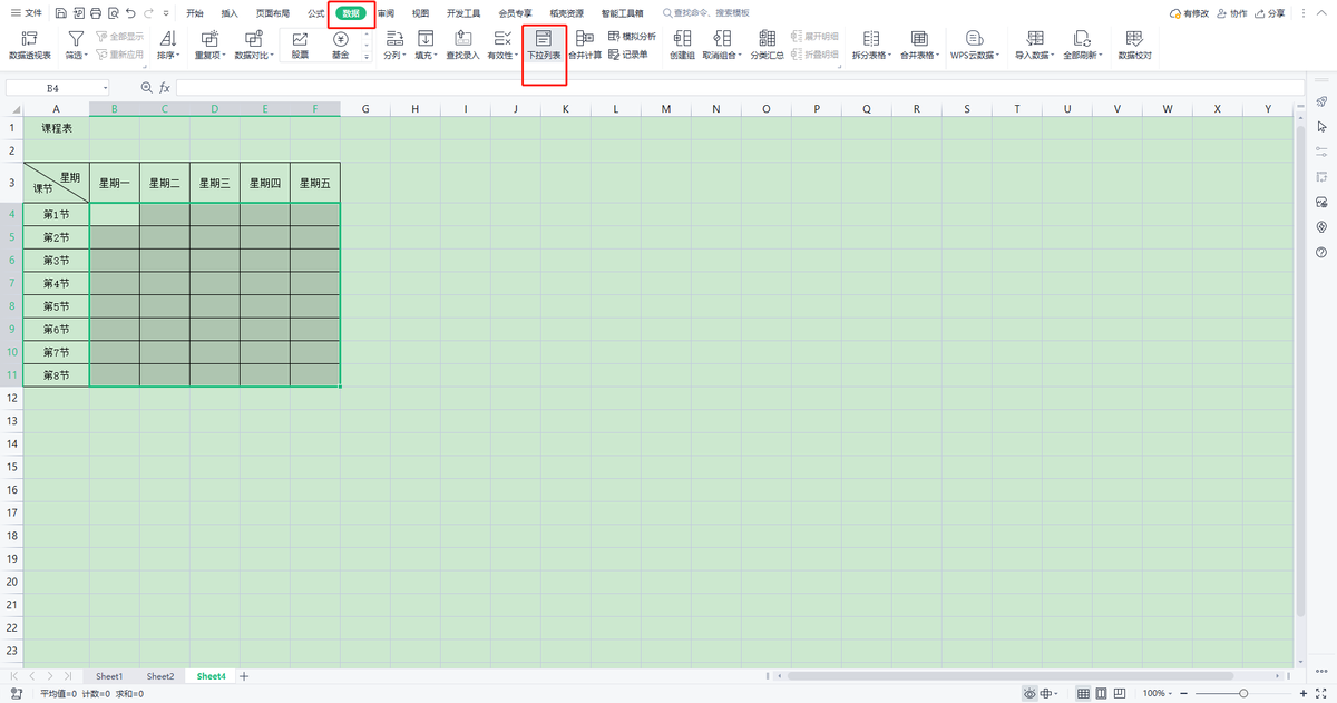 14、我们再用鼠标选中B4到F11单元格,在顶部选择“数据”菜单,二级菜单中选择“下拉列表”;