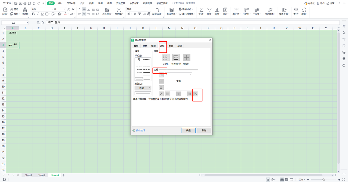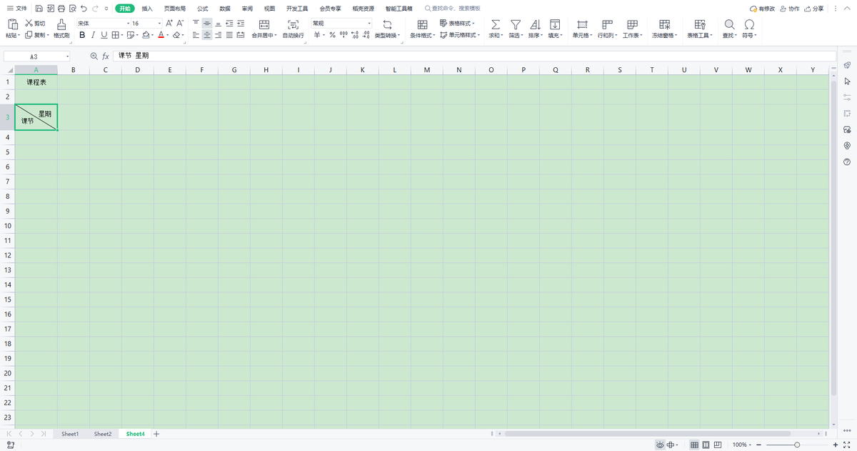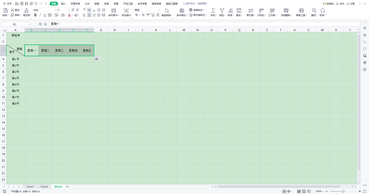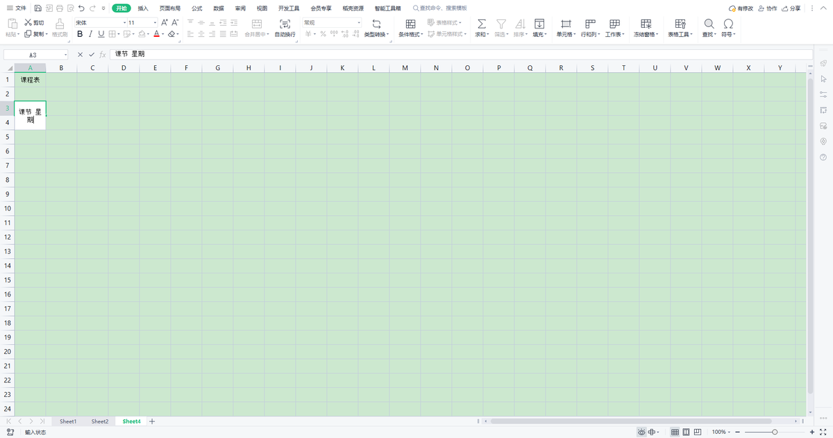 3、然后在第三行的第一个单元格中输入“课节”和“星期”;