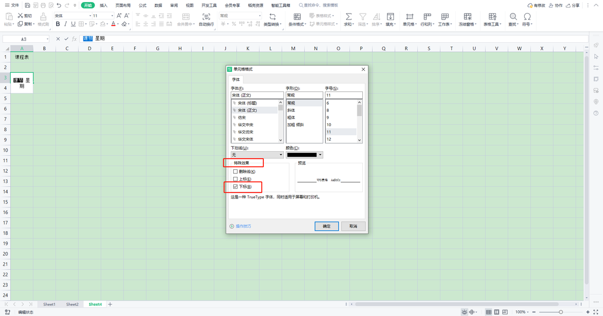 5、弹出“单元格格式”对话框后,我们在“特殊效果”选择栏中选择“下标”选项,再点击“确定”按钮;