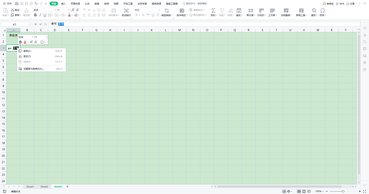 4、输入完后,用鼠标选中“课节”两个字,鼠标右键,在弹出的下拉选项中,选择“设置单元格格式”;