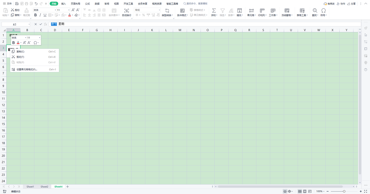 6、我们使用同样的方法,鼠标选中“星期”两个字,鼠标右键,选中“设置单元格格式”;