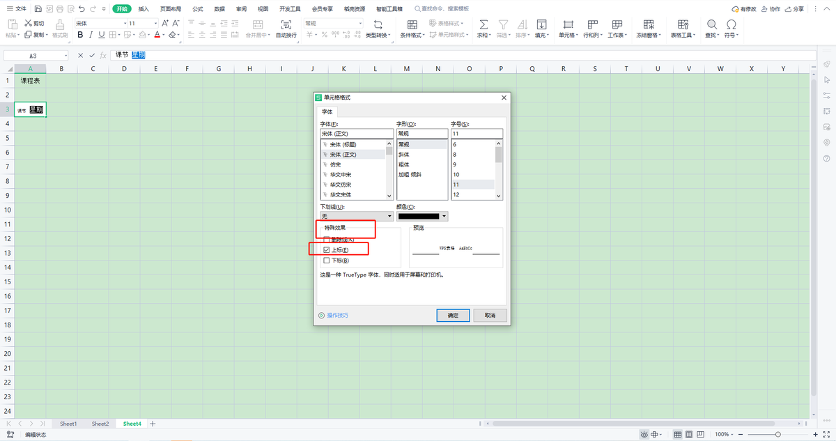 7、弹出“单元格格式”对话框后,在“特殊效果”选项栏中选择“上标”选项,再点击“确定”按钮;