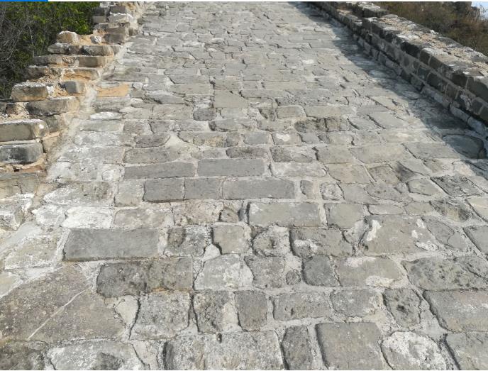 山脊稍缓的段位阶石平铺,立陡的段位阶梯状铺设。有的阶石棱角分明,大多位于城墙两侧,有的阶石棱角缺失,已被磨掉,大多铺于中间。