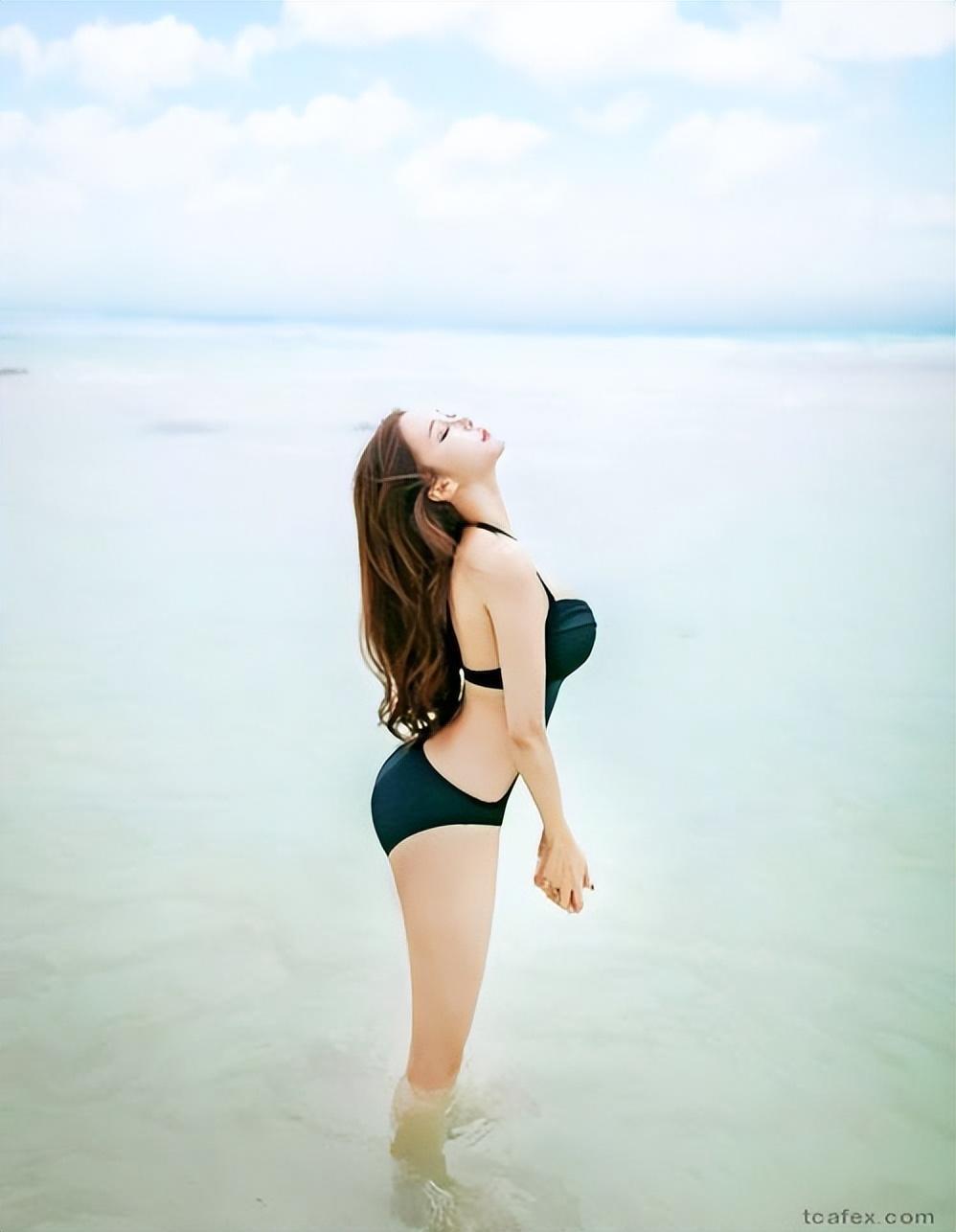 在一个美丽的沙滩上,一个身穿泳装的美女出现在人们的视线中。她优雅地站在海滩上,阳光洒在她的身上,映衬出她完美的轮廓和令人叹为观止的身材。她穿着一件黑色裹胸泳装,这种设计恰到好处地凸显了她的曲线和迷人的魅力。黑色的泳装给她增添了一份神秘感,使她更加引人注目。