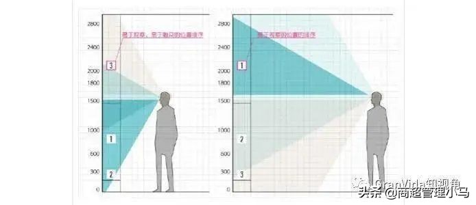 人的平均视觉是110—120度,可视宽度范围为1.5m 到2m;顾客在超市内步行购物时的视角为30度,可视范围为 1m。